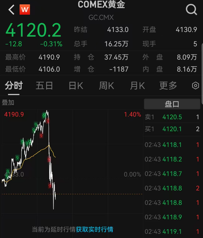 值得在意的是,10月以来,海外金价涨势加快,波动权贵加重。在“十一”时期初度冲破4000好意思元/盎司的紧迫关隘后,金价于10月14日献技“过山车”行情。放置发稿时,伦敦现货黄金最高涉及4179好意思元/盎司后大幅回调至4110好意思元/盎司。COMEX黄金期货也一度涉及4190好意思元/盎司,随后回落至4120好意思元/盎司。
