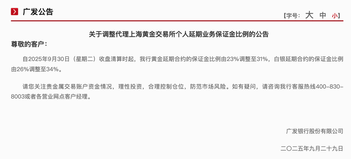招商银行、祥瑞银行也于9月26日收盘清理后调养了Au(T+D)等合约的保证金比例。此外,农业银行自9月26日收盘清理时起,将Au(T+D)、mAu(T+D)合约下一往未来起涨跌幅度划定从13%调养为15%;Ag(T+D)合约下一往未来起涨跌幅度划定从16%调养为18%。