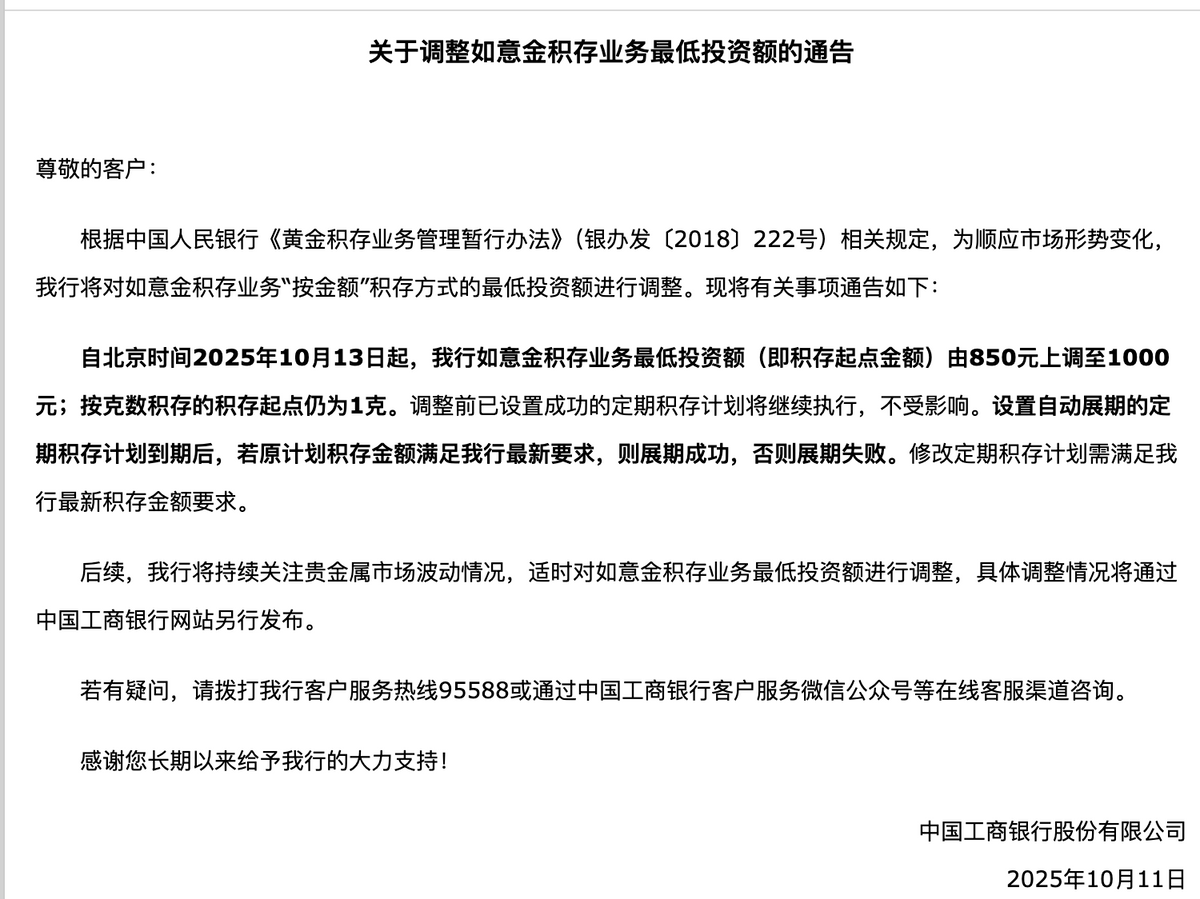 这次银行贵金属业务的调养呈现出显然的协同性和实时性。除了发布贵金属价钱波动风险领导除外,工商银行还对如意金蓄积业务最低投资额进行调养。